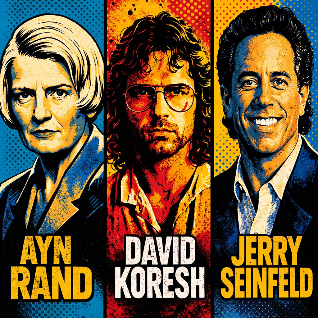 The phraseology is worth pausing on. Notice the juxtaposition of individual (“I”) and group (“a cult”). This quick and undeniably factual side-step could only be exploited by cults with individual leaders and was done so identically, decades apart, by these three wholly unrelated nabobs. The three charismatic figures in question — Ayn Rand (philosopher-novelist), David Koresh (Christian sect leader), and Jerry Seinfeld (an entertainer with an extraordinarily large and devoted fanbase) — motivate this analysis of the phrase’s significance and of the individual-versus-collective paradigm in cults.